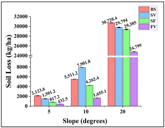Furthermore, the sediment loss for the microplots was also measured and analyzed. A substantial decrease in sediment loss was recorded across all plots and slopes, as shown in Figure 11. This means that incorporating vegetation, RSPF blocks, and the combination of the two helped prevent soil loss at any slope. However, this did not apply to the SV plot at a 10° slope.
