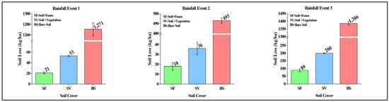 Soil loss under natural rainfall events for microplots with bare soil (BS), soil with vegetation (SV), and soil with embedded RSPF blocks (SF), showing a better performance of SF in reducing soil loss compared with SV.