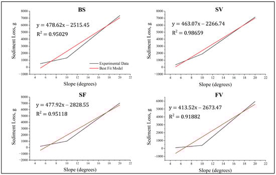 The results shown in Figure 13 reveal an interesting linear relationship determined through curve fitting between soil loss and land slope across all plot setups: BS, SV, SF, and FV. This is supported by a relatively high coefficient of determination (R2) ranging between 0.92 and 0.99. These relationships reiterate that soil erosion depends on the land slope and plot type/soil cover.