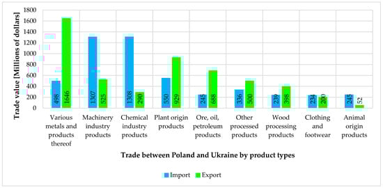 On the other hand, for Poland, trade relations with Ukraine did not exceed 1.5% of its international trade volumes. Therefore, due to a significant economic development lag, Ukraine turned out to be more dependent on the results of this cooperation. To obtain an idea of the volumes of external trade between the two countries by type of product, one can refer to the data in Figure 1.