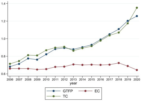 indicates the progress of green technology in the province during the period from to , specifically the movement of the technological frontier. Meanwhile, represents the changes in the efficiency of green technology in the province during the period from to .