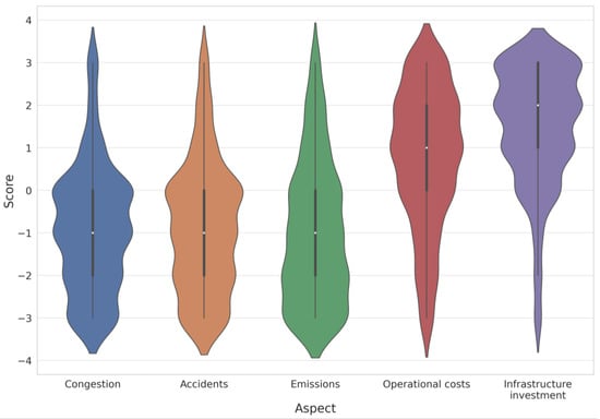 In the case of “Congestion”, “Accidents”, and “Emissions”, the median score is , indicating a consensus among the experts that these trends will have a moderately positive impact (i.e., a reduction) on these aspects. Specifically, the mean scores for “Congestion”, “Accidents”, and “Emissions” are , , and , respectively. Furthermore, the 25th and 75th percentiles for each of these subcategories are −2 and 0, indicating that half of the scores lie within this range, demonstrating a moderate to strong belief in the positive impact.