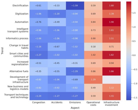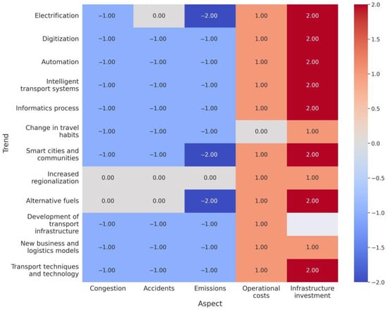 The first group encompasses “Electrification”, “Automation”, and “Intelligent Transport Systems”. These trends are unified by a salient relationship between a pronounced decrease in emissions (−3) and an associated increase in infrastructure investments (+3). The trends within this group represent a paradigm shift towards environmentally sustainable transportation solutions that, while significantly reducing emissions, also require substantial infrastructure outlays. Notably, “Intelligent Transport Systems” differentiates itself within this grouping by additionally exerting a considerable negative impact on congestion (−3), highlighting its dual potential to enhance not only environmental sustainability but also traffic flow efficiency.