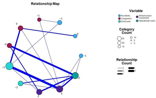 The in-build algorithm counts the number of connections between nodes (in our case, −3, −2, −1, 0, 1, 2, and 3) of different colours (in our case, aspects: accidents, congestion, emissions, infrastructure investments, and operational costs) and returns a radius of a node that is proportional to the number of links (edges in the relationship map graph). In addition, the thickness of the links between the nodes is proportional to the number of identical answers. The relationship map graphs were created for all 12 trends using the following settings: the link size was 10 (the thickest link is 10 times wider than the thinnest), and the threshold for the presented link between two nodes was the existence of five connections between them. The node size is proportional to the number of links connected to a given node. According to the above, for each trend in the corresponding relationship map, the most significant relationships between different aspects correspond to the thickest links between two nodes (see the example below). Using these settings, the resulting graphs ensure clarity and readability for all 12 trends. For the sake of brevity, we present only a relationship map for the electrification trend (Figure 4); for other trends, we provide below just the main observations.