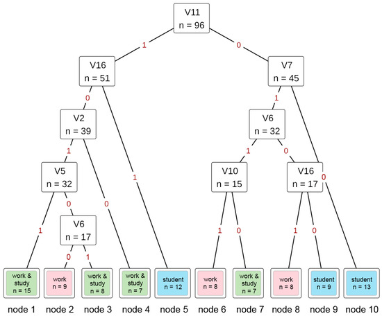 The respondents’ answers from the second stage of the study allowed us to identify characteristic groups of variables with which the respondents associated the term “green entrepreneurship” and the groups of respondents who indicated an understanding of green entrepreneurship in a specific aspect. It also allowed for the identification of the determinants of these indications, as well as similarities and differences between Poles and Slovaks in this respect. For this purpose, the classification and regression trees method (C&RT) was used [90]. For the purposes of this study, JASP 0.18.1 software was used to create the tree. The dependent variable was the socio-professional status of the respondents specified in the research tool (survey).