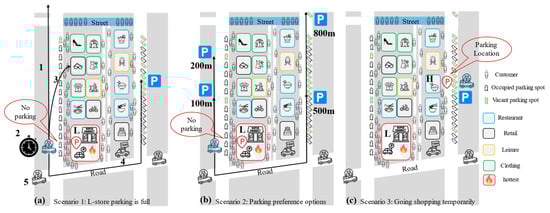 In this scenario, the purpose is to investigate the economic loss that shops may suffer due to parking issues. The paper provides five options, as shown in Figure 2a. Route 1 is to not visit the TBD at all. Route 2 is to postpone the visit to the shop until there is available parking. Route 3 is to switch to another shop with available parking. Route 4 is to find a parking space farther away and then proceed to the intended shop. Route 5 is to change the mode of transportation. These five routes can be classified into two groups based on whether the customer leaves the intention to L store.