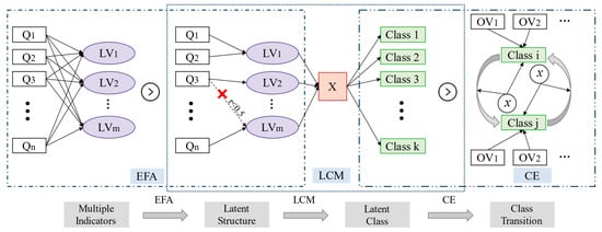 The research methodology and process of this study are illustrated in Figure 3. Firstly, exploratory factor analysis (EFA) was conducted to reduce dimensionality and identify the latent structure, thus making the variables interpretable. Subsequently, based on the key factors obtained in the first step, customers were classified using LCM, and the effects of covariates on customer types were explored. Finally, using the customer classes in the second step, the study investigated which type of customers could generate higher profits for the store based on the principle of CE, as well as how to encourage customers to spend.