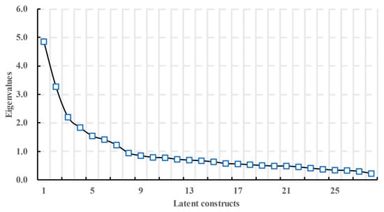 Based on Table 3, five factors were predetermined. Using exploratory factor analysis, it was found that the first and third factors (CE, HCP) could be further subdivided into two factors each. Additionally, the first item (PA-1) of the fifth factor (PA) was found to interfere with the questionnaire’s validity. Therefore, after eliminating an ineffective item, the remaining 28 items were divided into seven factors. The scree plot (Figure 4) and the rotated component matrix (Table 4) are shown below.