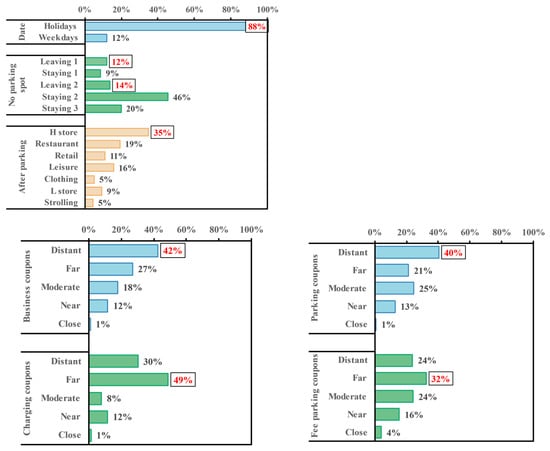 In this scenario, the purpose is to explore which type of parking space customers prefer when different parking options are provided at varying distances. The paper designs six choices, as shown in Figure 2b, which is just one example. Considering the diverse forms of incentives and to ensure independence between different combinations, the paper designs 16 incentive scenarios, as outlined in Table 1. The scenarios cover various factors, including parking coupons (DP), parking charging discounts (DC), consumption coupons (DB), and free parking with maximum purchase (DF). The incentive levels are set differently for holidays and weekdays. For instance, for a parking spot located 500 m away, customers are provided with two levels of parking fee coupons (70% and 60%) to choose from under the given incentive scenario.