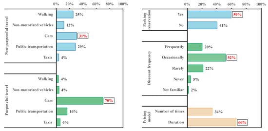 There is a significant difference in transportation mode choice between purposeless trips and purposeful trips. Taking private cars as an example, the proportion of private car usage for purposeless trips is 31%, but it increases to 70% for purposeful trips, which is nearly twice as much. Additionally, more than half of the respondents (59%) have had parking reservations, and over half (52%) of them enjoy parking coupons occasionally. The majority (66%) prefer to be charged based on the parking duration.