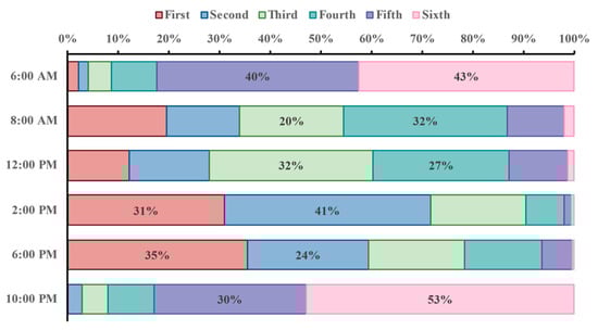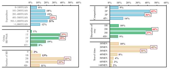 The respondents have a relatively high average consumption level. They typically spend around 20 min (42%) to 30 min (31%) traveling to BD. They usually travel in groups of 2 people (42%) to 3 people (36%) together. The average duration of their stay at BD is typically 2 h (44%) to 3 h (37%). The average spending per visit ranges from 401–500 yuan (23%). Furthermore, they visit BD a time (37%) to 2 times per week (35%). The majority of respondents have 2 BD locations (41%) to 3 BD locations (33%) near their residential areas. Their preferred departure times for BD are in the afternoon, with 2:00 PM and 6:00 PM being the top choices, followed by 8:00 AM and 12:00 PM. Most respondents consider 6:00 AM and 10:00 PM as the least likely times to visit BD.