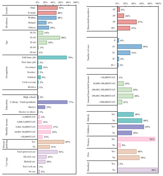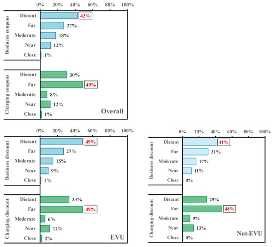 CCS (46%) and RCS (33%) are the primary users among EVUs. They mainly consist of young and middle-aged women from Beijing who work full-time and have a college/university education. They are married with children and have a high monthly income. Additionally, they have a higher CE, HCPA, and PR. Comparing the data from the overall survey respondents to those who are Not-EVUs, it is observed that the BD coupons attract more EVUs to park at distant distances (8%). Furthermore, parking and charging incentives attract more EVU (4%) to park at far distances. It can be inferred that EVU and Not-EVU have different preferences for parking and charging facilities, although the difference is not significant. This might be due to the smaller sample size of EVUs (23%) or the relatively short duration of visits to TBD (81% within 2–3 h).
