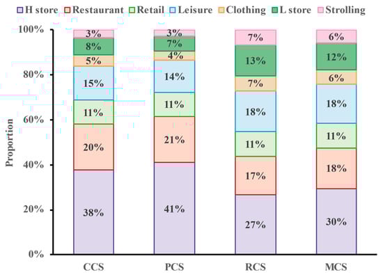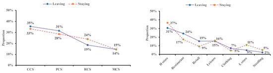 Among the 124 respondents who left the store, the proportions of the four identified classes are as follows: 35%, 31%, 19%, and 15%. The comparison between the leaving and staying respondents is illustrated in Figure 15. Relative to the staying respondents, those who left the store showed a higher preference for restaurant and retail stores. On the other hand, the staying respondents often had higher expectations for their intended destinations. Among the staying respondents, there was a notably higher proportion of RCS, which aligns with their significant PA.