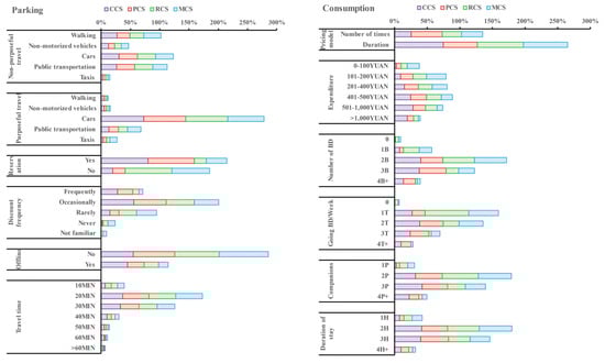 In Scenario 3, there are significant differences among the four classes in their choices between temporarily going to shops near the parking spot and going directly to their destinations, while other aspects show no clear differences. CCS and PCS have a higher proportion of choosing to visit shops near the parking spot, with CCS accounting for nearly half of them (41%). In contrast, RCS and MCS prefer to go directly to their destinations.