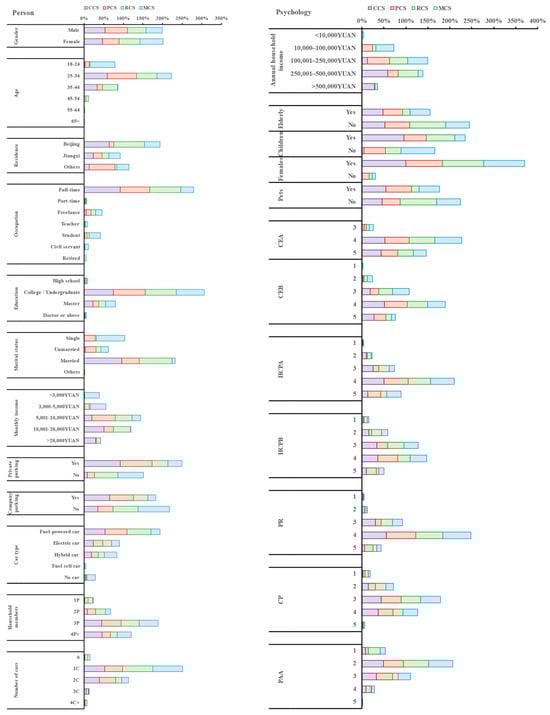 - Class 2: PCS. This class mainly comprises young males, primarily from non-Beijing areas, with a college/university education and low monthly income. They have experience with parking reservations and own parking spots. Their households own 1–2 cars, and they have a low annual family income. Furthermore, their consumption level mostly ranges from ¥200 to ¥500, and they have a higher CEB, HCP, and PR. Relatively, they prefer parking spots with greater coupons.