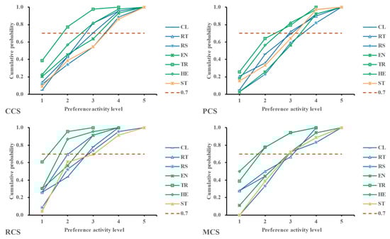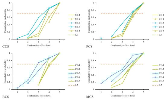 Overall, the four classes exhibit relatively high CE, averaging around 3.9 out of 5. When ranked from highest to lowest, the order is as follows: PCS, CCS, RCS, and MCS. Based on the four cumulative probability distribution charts mentioned above, using a cumulative probability of 0.7 as a dividing line, it can be observed that all four classes have high CE-2 and CE-5 ratings but low CE-3 ratings. In relative terms, CCS and RCS show more dispersed ratings in CE, while PCS and MCS are relatively concentrated. Among them, CCS and RCS have lower CE-3 and CE-4 ratings, while PCS demonstrates a more concentrated CE distribution. Additionally, CE-3 has the lowest rating among all classes.