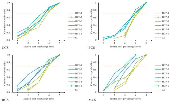 Overall, the HCP ratings for the four classes are generally moderate, averaging around 3.5 out of 5. When ranked from highest to lowest, the order is as follows: PCS, RCS, MCS, and CCS. From the graph, it can be observed that CCS has almost identical ratings for each HCP sub-item, while the other classes show clear distinctions between odd-numbered and even-numbered sub-items. Among them, MCS shows the most distinct pattern, with lower HCPB ratings and higher HCPA ratings. Additionally, the largest gap is observed between HCP-3 and HCP-4.