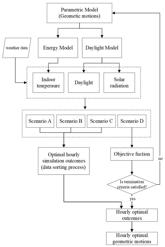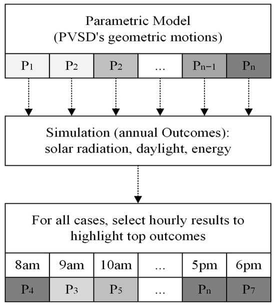 Two separate approaches were employed to ascertain optimal hourly performance outcomes and their corresponding geometric motions: post-data sorting and an optimization process. The data sorting process identified the best hourly outcomes from all possible independent simulations representing the movements of PVSD options. For example, the parametric PVSD model displays motions from P1 to Pn, as shown in Figure 2, with the optimal outcome for each hour being selected, demonstrating its corresponding geometric state (e.g., motions at 8 am and 9 am correspond to geometric states P4 and P3, respectively). Thus, the most effective operation scenarios are presented by amalgamating these hourly motions. Similar methods for evaluating PVSD performance have been noted in previous research [31]. The optimization process is effective in efficiently obtaining optimal hourly outcomes, especially when considering a large number of PVSD operation patterns [32]. Based on the analysis of the PVSD’s performance, Scenarios A to D were defined, and subsequently, a choice was made between data sorting and the optimization process. Details regarding the PVSD scenarios are introduced in the following paragraphs.