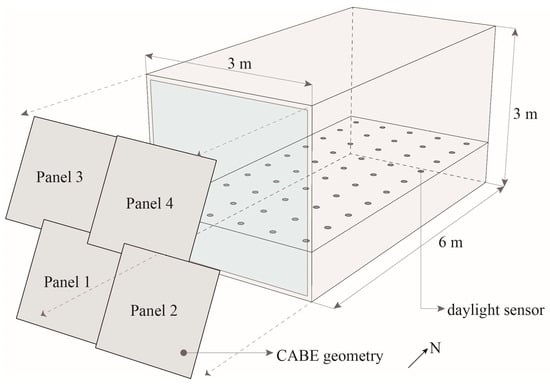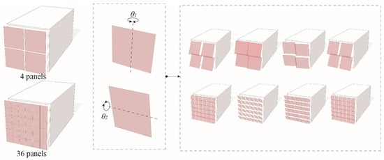 The geometric design and control strategies of the PVSD are crucial parameters for decision making during the design phases. The myriad combinations of geometric forms and their dynamic transformations present a challenge due to the vast array of possible PVSD designs. To address these design challenges, geometric motions of the PVSD can incorporate a variety of transformations including folding, sliding, expanding, creasing, hinging, rolling, inflating, fanning, rotating, and curling [35]. In this study, we utilized a combination of a rectangular PVSD geometry and rotating motion. While a rectangular geometry was adopted, we explored two different PVSD geometric patterns to assess the impact of control strategies. The first option divided the panel into four separate rectangles (1.43 m × 1.43 m each), while the second comprised 36 smaller rectangles (0.48 m × 0.48 m each). The geometry’s motion involved dual-axis rotation (θ1 and θ2), enabling coverage in all directions within its motion range. The gap between the window and the PVSD geometry was set at 0.5 m, limiting the maximum motion range for θ1 and θ2 to between −12° (west) and 12° (east), and −28° (lower) and 28° (upper), respectively (see Figure 4).