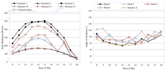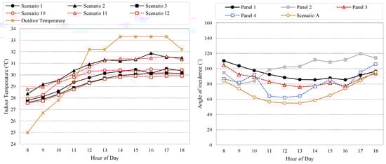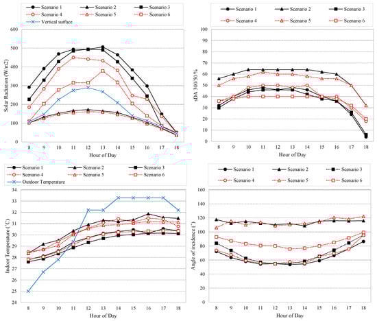 In Scenario D, a GA approach was employed to achieve optimal outcomes by allowing individual PVSD panel movement. Figure 7, Figure 8 and Figure 9 illustrate the outcomes for solar radiation, daylighting, and indoor temperature, as well as the hourly incident angle of each panel, in comparison to the results of Scenario A. The findings indicate that GA achieved marginally better outcomes (an average improvement of 0.14 °C) by moving each panel individually. However, Scenario A demonstrated superior performance in terms of solar radiation and sDA. Contrary to our initial expectations that individual movement might yield better results across all criteria, the results showed that a uniform movement of all panels, particularly with a larger size (i.e., the four-panel type), was the most effective design option among all the scenarios.