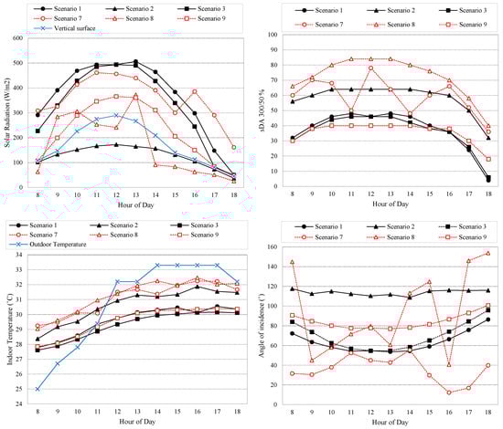 Scenario C utilizing 36 panels with an extended motion range demonstrated optimal performance in solar radiation (W/m2), daylighting (sDA 300/50%), and thermal efficiency (indoor temperature (°C)). The upper-left plot in Figure 6 presents the results for Scenario C#7 through #9, allowing a comparison with the earlier Scenario A#1 through #3. Scenario C#7 exhibited comparable performance, while Scenario A#1 resulted in the best solar performance. It is noteworthy that the 36 panels with the extended motion range (i.e., Scenario C#7) outperformed those with the previous range (i.e., Scenario B#4 in Figure 5), particularly after 3 pm. In addition, even Scenario C#8 outperformed the vertical BIPV system at some hours.