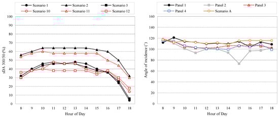The upper-right plot displays the results prioritizing daylighting, where Scenario C#8 exhibited the best daylighting performance. Daylighting performance in Scenario C#8 showed an average increase of 14% and 36% in sDA300/50% compared with Scenario A#2 and Scenario C#7, respectively. Even Scenario C#7 showed superior performance compared with Scenario A#2, except at 11 am, 2 pm, and 3 pm, when the four panels moved within the limited motion range. The lower-left plot reveals the results prioritizing thermal efficiency. Compared with Scenario B with 36 panels using the limited motion range in Figure 5, Scenario C with 36 panels using the extended motion range showed worse performance. The lower-right plot illustrates the incident angle, indicating that Scenario C required up and down incident angles. In summary, Scenario A with 4 panels consistently outperformed Scenario C with 36 panels using the extended motion range, except in the case of daylighting priority.