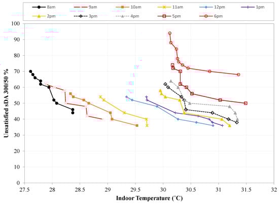 The primary benefit of installing a PVSD is to achieve both conflicting performance criteria (e.g., minimizing energy loads while maximizing daylighting conditions) in line with occupant preferences. Figure 10 presents hourly Pareto front solutions based on Scenario A, including 377 cases per hour, amounting to a total of 4147 cases. From 9 am to 4 pm, the sDA performance remained relatively consistent, ranging between 40% and 65%. In comparison, the range of indoor temperature was wider than that of daylighting performance during these hours. This suggests that thermal performance is more sensitive to changes in the motion of the PVSD within these time intervals. Conversely, daylighting performance saw a decline at 5 pm and 6 pm. During these hours, both daylighting and thermal performance were significantly affected by the geometric motion of the PVSD, particularly near an indoor temperature of 30.5 °C and an sDA of 30% to 40%. Table 3 indicates the results that meet the daylighting recommendations of LEED v4. A greater number of solutions were found for 1 pm, diminishing towards the morning and afternoon.
