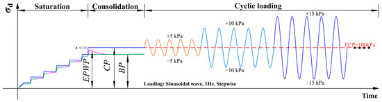 Diagram of saturation, consolidation and stepwise cyclic loading of this study (CP: Cell Pressure; BP: Back Pressure EPWP: Excess Pore Water Pressure; ECP: Effective Confining Pressure).