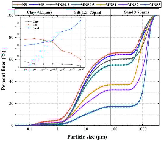 Particle size distribution curves of each sample (NS: natural soil; MS: heavy metal contaminated soil; MNS0.2: soil treated with 0.2% nZVI).