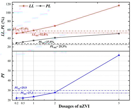 - Upon nZVI treatment, a continuous increase in LL, PL, and PI values were observed, correlating with rising dosages. Heavy metal cations caused a decrease in that of MS. The increase was primarily due to the formation of hydroxide adsorption and aggregation structures as a result of the nZVI reactions. Additionally, residual nZVI presented in the soil continued to react with water added during the experimental process, further contributing to the increase in the measured Atterberg limits.