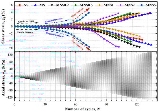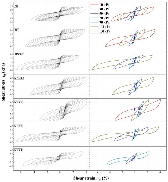 From the hysteresis characteristics, the evolutionary patterns of all samples were meticulously delineated, as illustrated in Figure 5. The hysteresis curves of the samples uniformly exhibited non-linear behavior, describing a willow shape. Furthermore, with an increasing number of cycles, a notable enlargement in the area of each hysteresis loop was observed, accompanying a gradual flattening, along with accumulation and increase in irreversible plastic strain. Initially, the hysteresis curve of NS shifted from a dense and symmetrical feature with minimal cumulative strain. In the presence of contaminants, it a compactness feature at small strains was exhibited (i.e., Low cyclic loading level) and observed, whereas at large deformations (High cyclic loading level), a rapid expansion in the curve’s area was evident, alongside progressively increasing tensile strains along with each loading step. Upon addition of nZVI, a distinct transition point in hysteresis characteristics should be noted at a 1% dosage. For instance, an initial increase was followed by a decrease in shear strain along with the step loadings, with a reversed trend in tensile strain. Under higher cyclic loadings, the curve’s shape rapidly changed from shuttle-like to an elongated willow leaf shape. Notably, the initial rightward shift and subsequent re-stabilization of the curves at a 1% nZVI dosage (MNS1) indicated an internal particle rearrangement and compression process, which could lead to a stable and solid skeleton.