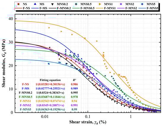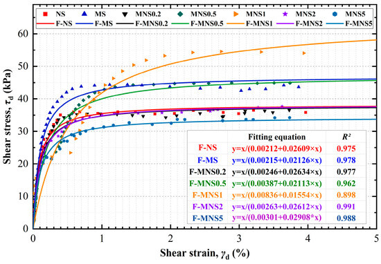 The stress–strain curves (backbone curves) for soils treated with various nZVI dosages were constructed. The curves were selected from the peak points of the half-cycle compressive stress peak points at the fifth cycle under each load, with fitting using the Hardin–Drnevich model. The backbone curve reflected the dynamic stress–strain relationship of the soil at different dynamic stress amplitudes, and for the dynamic shear modulus of the treated soil.