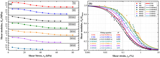 - The fitting analysis of the Hardin–Drnevich model revealed that the variation in shear modulus for all soil samples remains relatively consistent pattern in the small strain range. Among these, the MNS1 possessed the maximum shear modulus of 39.3 MPa. This indicated a notably higher stiffness of MNS1 compared to that of other samples in this strain range. Further overall examination analysis highlighted that MNS1 exhibits superior resistance to attenuation of shear modulus, as observed in the strain–stress relationship.