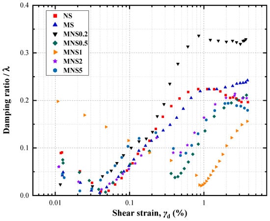 - For all samples except MNS1, the variation in the damping ratio exhibited an “S” shaped trend, while MNS1 demonstrated a “V” shaped trend. Specifically, in the small strain range, MNS1 displayed a larger damping ratio, attributable to the solid skeleton structure formed by nZVI between soil particles. Under cyclic loading conditions, the disintegration and rearrangement of larger soil particles occurred, leading to a reorganization of the soil skeleton structure. The phenomenon was recognized as an enhancement of the soil skeleton’s strength and an increase in the damping ratio.