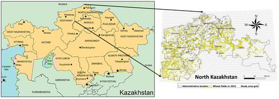 The region’s share of gross wheat harvest (including winter and spring wheat) accounted for 23% of the total wheat production in the country for the last three years. Figure 1 illustrates the wheat fields in 2021 in the study area. According to data from the National Statistics Bureau, the average wheat yield in the North Kazakhstan Region for the period from 2020 to 2022 was 1250 kg per hectare [44].