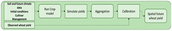 After preparing the above input data in the appropriate format (administrative boundaries in SHP, weather in WTG, soil in SOL, management in tabular form, etc.), we ran the crop model and calibrated wheat yield with the observed data to obtain a spatial future wheat yield for the study area with a resolution of 5 arcminutes (Figure 2).