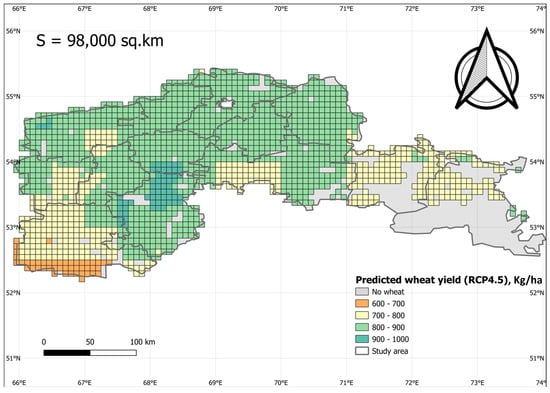 According to Table 2, the average wheat yield under RCP 2.6 was 831.1 kg/ha in the North Kazakhstan region. To illustrate the spatial variability of wheat yield, a map was compiled based on the crop model and environmental data (Figure 3). The results demonstrated the homogeneous distribution of wheat yield over the study area, since around 70% of wheat fields had 800–900 kg/ha yield under RCP 2.6. Potentially, in almost 20% of the study area, which is primarily located in the southwestern part, farmers could harvest the highest yield of 900–1000 kg/ha of wheat without any technological modernizations and genetic modifications in the mid-century. Nevertheless, eastern and southwestern parts of the study area, which are located in the arid steppe zone, had the lowest yield of 600–700 kg/ha (<3%) and 700–800 kg/ha (10%), respectively.