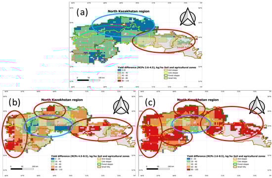 Predicted wheat yield difference in kg/ha between RCPs 2.6–4.5 (a), 4.5–8.5 (b), and 2.6–8.5 (c) in the North Kazakhstan region. Blue and red circles indicate favorable and unfavorable areas, respectively.