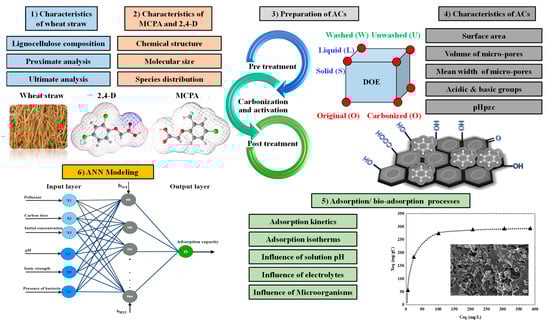 The methodology of the current study is illustrated in Figure 1. It includes the following phases: Phase 1: characterization of raw wheat straw; Phase 2: characteristics of 2,4-D and MCPA; Phase 3: preparation of AC; Phase 4: characterization of AC; Phase 5: adsorption/bio-adsorption processes; and Phase 6: ANN modeling.
