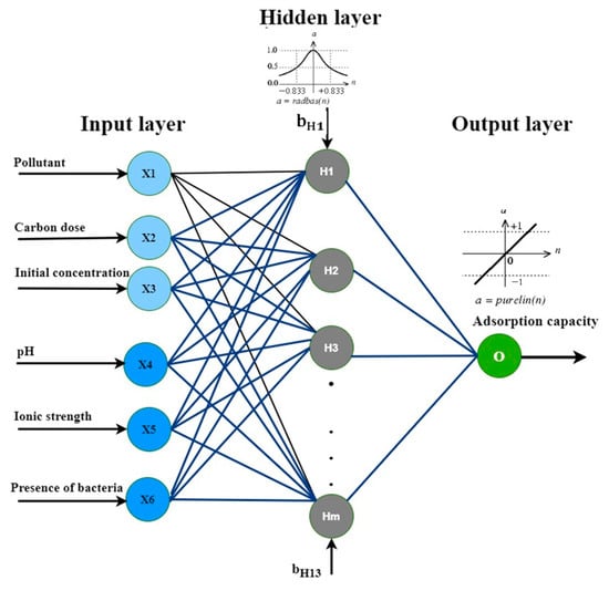 Artificial neural networks (ANNs) have gained popularity as the method of choice for modeling and predicting a wide range of environmental issues [,,]. They offer several advantages over traditional methods, including the capacity to learn intricate input/output relations, parallel computing, and generalization. ANN models have found success in environmental engineering applications, including for water resources and wastewater and water treatments []. To check the consistency between the projected and observed concentrations of important parameters, ANNs are widely used in a range of environmental applications [,]. Two factors contribute to the good performance of ANN modeling: first, it allows for theoretical analysis, and second, it provides a practical model for predicting the level of output parameters given similar input data. When used to analyze data to estimate the adsorption capacity based on the pollutant under study, carbon dose, initial concentration, pH, ionic strength, and presence of bacteria, ANN modeling is a less complex and faster method that yields good findings.