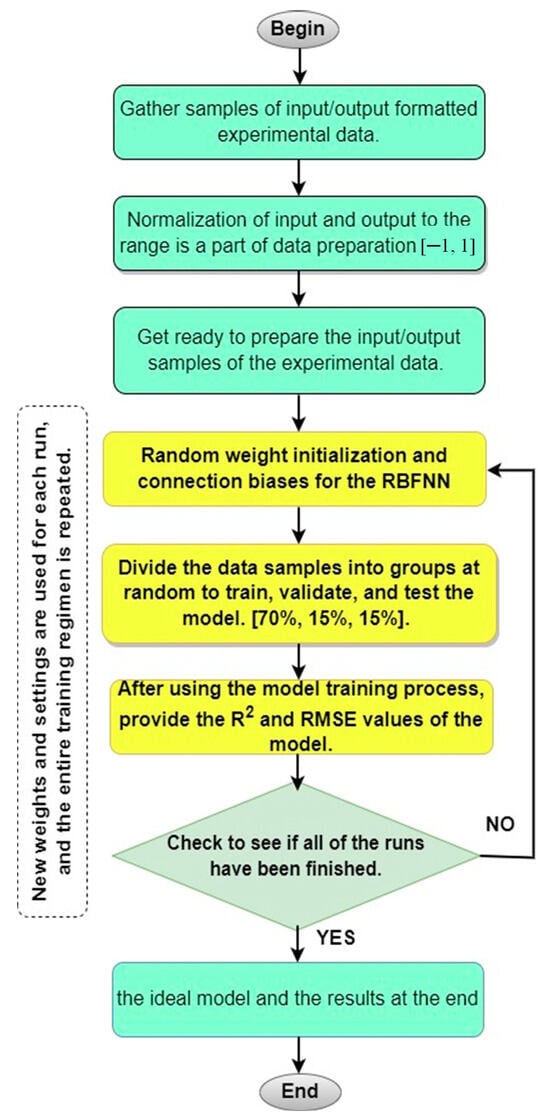 The RBFNN-based prediction model’s training process is depicted in the flowchart shown in Figure 4. A training group of 70%, a validation group of 15%, and a test group of 15% were randomly selected from the data samples. In many different applications, the test criterion for neural network models often falls between 70 and 30 percent. This criterion has been extensively utilized in other research with related objectives []. A set of weights and biases for each randomly chosen connection were used to train the RBFNN-based model. The R-squared coefficient (R2, calculated using Equation (11)) and the root mean square error (RMSE, calculated using Equation (12)) were used to assess the model’s performance. The equations are as follows: