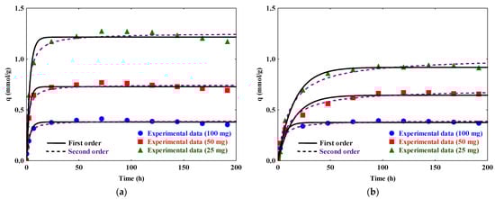 where q is the adsorption yield in mmol/g; qpred,1 is the adsorption yield predicted from the first-order kinetic model in mmol/g; qpred,2 is the adsorption yield predicted from the second-order kinetic model in mmol/g; k1 is the adsorption rate of the first-order kinetic model in L/h; k2 is the constant of the second-order kinetic model in g/mmol/h; and t is the time in h.