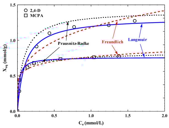 The initial 2,4-D or MCPA concentrations used to estimate the adsorption isotherms of the best AC sample were 50, 100, 200, 300, 400, and 500 mg/L. Equations (5)–(7) reflect the Langmuir, Freundlich, and Prausnitz–Radke adsorption isotherm models. These models are considered the most popular models for the adsorption process and can be used to establish the adsorption type and mechanism: