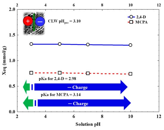 Effect of pH on the adsorption of MCPA and 2,4-D onto CLW at [C]o = 500 mg/L and T = 25 °C.