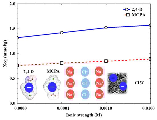 Influence of ionic strength on the adsorption of 2,4-D and MCPA onto CLW at [C]o = 500 mg/L and T = 25 °C.