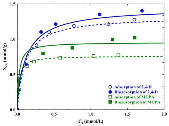 Figure 7 shows the adsorption isotherms of MCPA and 2,4-D onto CLW at pH ≈ 3.5 and T = 25 °C. According to Giles classification, both adsorption isotherms exhibited L-behavior [,], which means that a concave curve is produced when there is a decrease in the ratio between the residual concentration of both contaminants in the aqueous solution and their adsorbed quota onto CLW. Additionally, such a behavior demonstrated a strong affinity between the molecules of the adsorbate and the surface of the adsorbent. Moreover, it verified that the two aromatic rings connected to both pollutants were adsorbed parallel to the surface of the AC [,,].