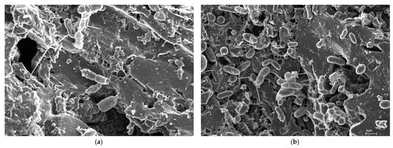 The 2,4-D and MCPA bio-adsorption isotherms onto CLW in the presence and absence of microorganisms are shown in Figure 10. The Langmuir equation was applied to these isotherms and revealed that the presence of microorganisms during the adsorption process improved the adsorption capacity of CLW by 17% and 32% for 2,4-D and MCPA, respectively. These results may be attributed to the surfaces of microorganisms, such as bacteria or fungi, which often contain functional groups (e.g., hydroxyl, carboxyl, and amino) that can act as adsorption sites for certain pollutants or ions. Moreover, Abdel daiem et al. [] reported the following changes in the chemical and textural characteristics of AC caused by microorganism adsorption: (i) a decreased external surface area because of pore blocking and (ii) a decrease in the pHPZC value, which increases the density of negative charges on the AC surface. Additionally, as phospholipids make up the outer layer of bacteria [], their adsorption onto an AC improves the carbon surface’s hydrophobicity, which greatly facilitates the adsorption of micro-pollutants in the aqueous phase such as 2,4-D and MCPA. Additionally, extracellular polymeric compounds are generated by bacteria on the AC, which improves the adsorption process and increases the adsorption capacity of the carbon material (Figure 11).