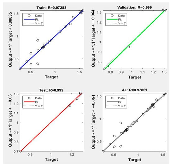The regression coefficients of the training, testing, validation, and overall models are all greater than 0.988, as demonstrated in Figure 13. The RBFNN forecasts for the entire data set are highlighted in Figure 14, showing that the predicted values closely resemble the experimental values. The experimental results and the RBFNN predictions for the test set are shown in Figure 15. The best network and training configurations were chosen by conducting research on the FBFNN hyper-parameters. The numerical results obtained from an evaluation of the test set’s hidden layer size are shown in Table 9 for a range of values (5, 11, 15, and 20). A slight improvement in model performance was obtained when 15 or 20 neurons were used in the hidden layer as opposed to 11. However, this came at the expense of increased training complexity. When 10 or fewer neurons were used, the hidden layer performed much worse (higher RMSE compared to using 20 neurons), as shown in Table 10. The optimal choice for the activation function was (radbas), while the triangular basis transfer function (tribas) or (tansig) yielded inferior RMSE results. In summary, a number of factors were taken into account when determining the ideal RBFNN training settings. The built RBFNN’s suitability for the obtained experimental data indicates that the model may be applied to accurately predict the output under similar experimental conditions. The model may also need to have its structure changed and retrained if the experimental parameters or inputs change. Still, the above-described procedure for selecting the optimal regression model proves to be valid.