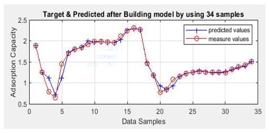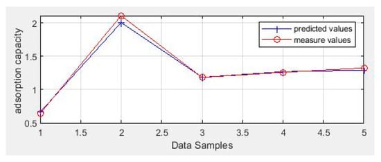 Table 11 presents a comparison of the numerical results of some related studies and the current work. Silva et al. [] divided 45 samples into 70% for training and 30% for testing a model to predict the sorption of diuron, hexazinone, and sulfometuron-methyl in different soils. Their FFNN model was relatively complex, with 12 input parameters; thus, a high RMSE was recorded (1.22). Sridevi et al. [] employed an FFNN model to predict the adsorption of 2,4-D onto AC generated from Ulva prolifera biomass, and they recorded an R2 = 0.96 and an RMSE = 0.1007. Dahlan et al. [] used an FFNN to model the adsorption process of 2,4-D onto a modified hydrogel using three input layers; the model complexity was substantially reduced, and they found high accuracy (R2 = 0.99 and RMSE = 0.0004). Isiyaka et al. [] reported the use of an FFNN model to predict the remediation of MCPA in an aqueous medium using an aluminum-based metal–organic framework and recorded high accuracy (R2 = 0.99 and RMSE = 0.0040). Thus, their FFNN model gave notable results, as shown in Table 11. The proposed model in the current work applies RBFNN to model the adsorption process in the removal of 2,4-D and MCPA from aqueous solutions. Although the current study included a higher number of neurons, which means higher complexity compared to the other studies, the applied model showed high accuracy (R2 = 0.69 and RMSE = 0.054).