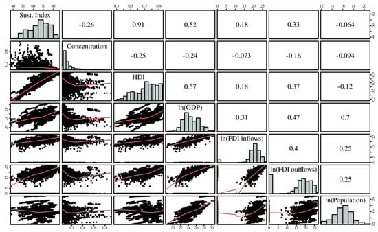 Next, we present Figure 1, which serves as a complement to the descriptive statistics. In the upper triangular part, we can observe the correlation between the variables under study, while in the lower part, we display a scatter plot to examine the relationships between the variables. Along the diagonal, we have histograms of the variables. The main elements to highlight are the relatively high correlations of the independent variables with the sustainability index, justifying their inclusion in the regression model, except for the natural logarithm of population, which exhibits low correlations but will be tested to verify the existence of a functional relationship. Elements of the analysis to be cautious about are the relationship between HDI and GDP, as well as the relationship between FDI outflows and GDP, and GDP and population size, which display high correlations that may lead to issues of multicollinearity and, consequently, parameter estimation problems.